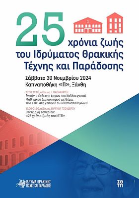 Στο πλαίσιο των εκδηλώσεων που έχουν προγραμματιστεί για τη συμπλήρωση 25 χρόνων πολιτιστικής ζωής και προσφοράς στην Ξάνθη, το Ίδρυμα Θρακικής Τέχνης και Παράδοσης έχει προγραμματίσει τα εγκαίνια της έκθεσης έργων του καλλιτεχνικού μαθητικού διαγωνισμού με θέμα «Το Ι.Θ.Τ.Π. στη γειτονιά των καπναποθηκών» και η επετειακή εσπερίδα «25 χρόνια ζωής του Ιδρύματος Θρακικής Τέχνης και Παράδοσης» το Σάββατο 30 Νοεμβρίου.