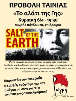 Ενόψει της απεργίας στις 9 Απριλίου, η “Ρωγμή” προβάλει την ταινία “Το αλάτι της γης” που αναφέρεται στην απεργία των εργατών ενός ορυχείου στο Νέο Μεξικό, το απόγευμα (19.30) της Κυριακής 6 Απριλίου στον χώρο της (Μ. Βόγδου 20, 4ος όροφος).