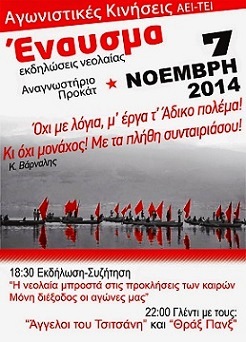 Στις 18.30 θα πραγματοποιηθεί εκδήλωση-συζήτηση με θέμα «Η νεολαία μπροστά στις προσκλήσεις των καιρών – μόνη διέξοδος οι αγώνες μας», σε μια προσπάθεια να ανοίξει η κουβέντα γύρω από το νέο τοπίο που διαμορφώνεται για τη νεολαία, αλλά και ποια η προοπτική για την ανάπτυξη κινήματος αντίστασης και ανατροπής της επίθεσης τού συστήματος.