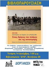 Το βιβλιοπωλείο «Δύο» και οι εκδόσεις «Εκτός των τειχών» παρουσιάζουν το απόγευμα (19.00) της Τετάρτης 14 Δεκεμβρίου το βιβλίο «1919-1922 – Απεσταλμένοι των ισχυρών για τη μεγάλη ιδέα – Στους δρόμους του πολέμου και της καταστροφής – Κείμενα για τη μικρασιατική εκστρατεία και την προσφυγιά».
