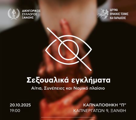 Διάλεξη με θέμα «Σεξουαλικά εγκλήματα: Αίτια, συνέπειες και νομικό πλαίσιο» διοργανώνουν το απόγευμα (19.00) της Δευτέρας 20 Οκτωβρίου στην καπναποθήκη «Π» το Ίδρυμα Θρακικής Τέχνης και Παράδοσης και ο Δικηγορικός Σύλλογος Ξάνθης.