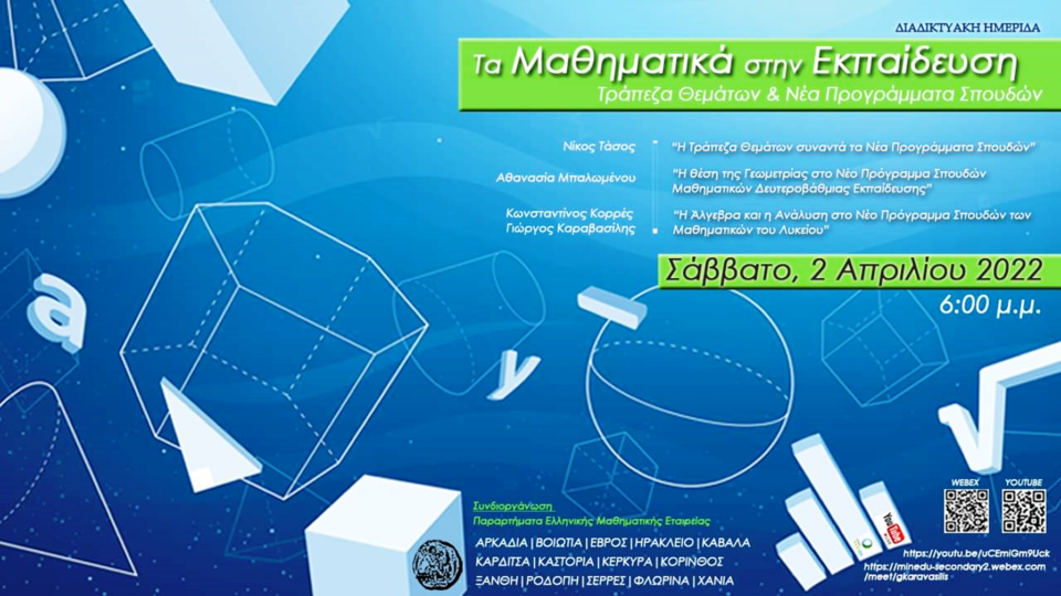 - Η θέση της γεωμετρίας στο νέο πρόγραμμα σπουδών μαθηματικών δευτεροβάθμιας εκπαίδευσης (Αθανασία Μπαλωμένου, συντονίστρια εκπαιδευτικού έργου ΠΕ03, ΠΕΚΕΣ Δυτικής Ελλάδας)