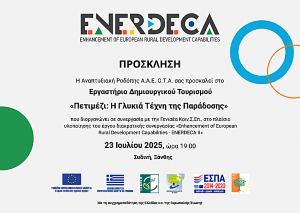 Δωρεάν εργαστήριο δημιουργικού τουρισμού με τίτλο «Πετιμέζι: Η γλυκιά τέχνη της παράδοσης» διοργανώνουν το απόγευμα (19.00) της Τετάρτης 23 Ιουλίου στη Συδινή (αντί της αρχικά αναφερόμενης Γενισέας) η Αναπτυξιακή Ροδόπης και η Γενισέα ΚοινΣΕπ.