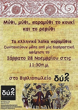 Με τίτλο “Μύθι, μύθι, παραμύθι, το κουκί και το ρεβίθι”, τα ελληνικά λαϊκά παραμύθια ζωντανεύουν μέσα από μια διαδραστική αφήγηση για παιδιά -και όχι μόνο- το πρωί (11.30) του Σαββάτου 28 Νοεμβρίου στο βιβλιοπωλείο “Δύο”.