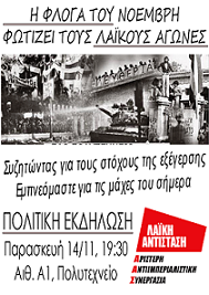 Εκδήλωση-συζήτηση με θέμα “Η φλόγα του Νοέμβρη φωτίζει τους λαϊκούς αγώνες – συζητώντας για τους στόχους της εξέγερσης, εμπνεόμαστε για τις μάχες του σήμερα” διοργανώνει η Λαϊκή Αντίσταση-Α.Α.Σ. το βράδυ (19.30) της Παρασκευής 14 Νοεμβρίου στην αίθουσα Α1 του πολυτεχνείου (προκατ).