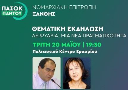 Η Νομαρχιακή Επιτροπή Ξάνθης του ΠαΣοΚ – Κινήματος Αλλαγής προσκαλεί στην εκδήλωση που θα πραγματοποιήσει με θέμα τη λειψυδρία το απόγευμα (19.30) της Τρίτης 20 Μαΐου στο Πολιτιστικό Κέντρο Ερασμίου.