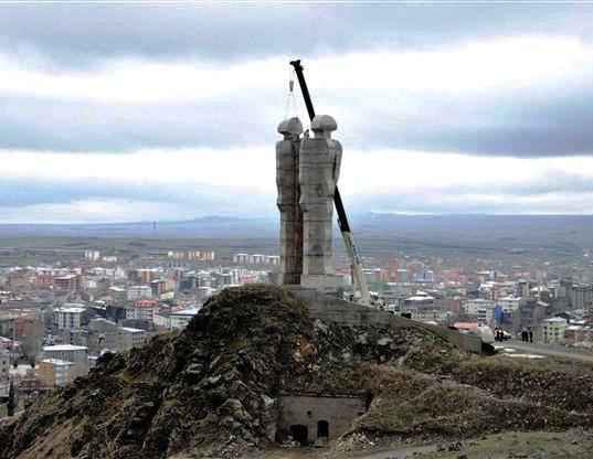 Σε κάθε περίπτωση φαίνεται ότι το γλυπτό έχει ενδιαφέρον… πολιτικό παρελθόν. Η υπόθεση ξεκίνησε το 2005 όταν ο τότε δήμαρχος του Καρς, Ναίφ Αλιμπέογλου, που είχε εκλεγεί με το κόμμα του Ερντογάν, ανέθεσε στον καλλιτέχνη να φτιάξει ένα γλυπτό που θα συμβόλιζε τη φιλία Τουρκίας- Αρμενίας. Ο Ακσόι έφτιαξε δυο τεράστιες φιγούρες που αντίκριζαν η μία την άλλη. Κανείς δεν διαμαρτυρήθηκε τότε. Το 2008 όμως ο δήμαρχος άλλαξε στρατόπεδο και εγκατέλειψε το κόμμα του Ερντογάν για το ρεπουμπλικανικό των Κεμαλικών αντιπάλων του. Έτσι, ενώ το μνημείο ήταν ακόμα στη φάση της ανέγερσής του, παρενέβη… το Συμβούλιο των Μνημείων και υποστηρίζοντας ότι το έργο βρίσκεται σε «ιστορική προστατευόμενη» τοποθεσία, ζήτησε την απομάκρυνσή του. Πράγμα που έγινε σταδιακά τα επόμενα χρόνια.