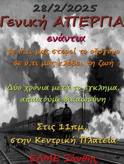 Καλούμε όλους τους πολίτες και επισκέπτες της Ξάνθης να συμμετάσχουν ενεργά στις δράσεις της απεργιακής κινητοποίησης, με μοναδικό σκοπό να μην ξεχαστεί το έγκλημα των Τεμπών και οι αθώοι άνθρωποι που χάθηκαν. Δύο χρόνια μετά το σιδηροδρομικό δυστύχημα, το έγκλημα των Τεμπών, καμία ενέργεια δεν έχει γίνει για την βελτίωση των σιδηροδρόμων ώστε να επιστρέψουν πιο αξιόπιστοι στην ελληνική κοινωνία.