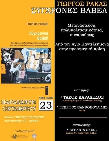 Τον συγγραφέα Γιώργο Ρακκά και το βιβλίο του «Σύγχρονες Βαβέλ: Μετανάστευση και πολυπολιτισμικότητα» παρουσιάζουν το απόγευμα (19.00) της Παρασκευής 23 Οκτωβρίου στη καπναποθήκη “Π” το Ίδρυμα Θρακικής Τέχνης και Παράδοσης και το Πολιτιστικό Αναπτυξιακό Κέντρο Θράκης.
