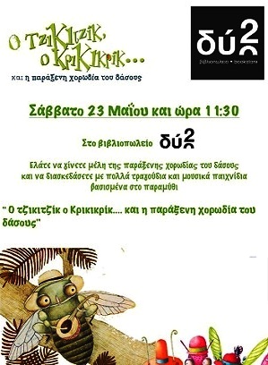 Το βιβλιοπωλείο “Δύο” προσκαλεί του μικρούς φίλους του να γίνουν μέλη της παράξενης χορωδίας του δάσους και να διασκεδάσουν με πολλά τραγούδια και μουσικά παιχνίδια βασισμένα στο παραμύθι “Ο Τζικιτζίκ ο Κρικικρίκ και η παράξενη χορωδία τους δάσους” το πρωί (11.30) του Σαββάτου 23 Μαΐου.