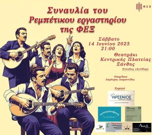 Το εργαστήρι ρεμπέτικης μουσικής της Φιλοπρόοδης Ένωσης Ξάνθης προσκαλεί στη συναυλία του το βράδυ (21.00) του Σαββάτου 14 Ιουνίου με ελεύθερη είσοδο στο θεατράκι της πλατείας Δημοκρατίας (έναντι Ο.Τ.Ε.).