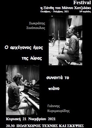 Ο αρχέγονος ήχος της λύρας συναντά το πιάνο στη συνάντηση των Σωκράτη Σινόπουλου και Γιάννη Κυριμκυρίδη το βράδυ (20.30) της Κυριακής 21 Νοεμβρίου στον Πολυχώρο Τέχνης και Σκέψης, στο πλαίσιο του φεστιβάλ “Η Ξάνθη του Μάνου Χατζιδάκι“.