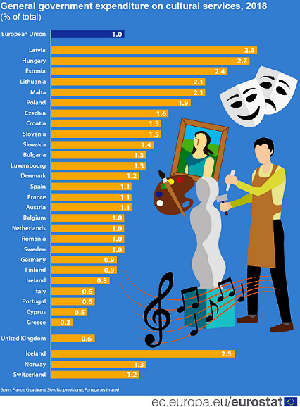 Αυτό το ποσοστό παραμένει σχετικά σταθερό με την πάροδο του χρόνου, αντιπροσωπεύοντας το 1,0% των συνολικών δαπανών της γενικής κυβέρνησης κάθε χρόνο από το 2013 έως το 2018. Ωστόσο, υπάρχουν σημαντικές διαφορές μεταξύ των κρατών μελών της Ε.Ε. Το 2018 η Λετονία κατέγραψε το μεγαλύτερο ποσοστό στις δαπάνες γενικής κυβέρνησης για πολιτιστικές υπηρεσίες (2,8%), ακολουθούμενη από την Ουγγαρία (2,7%) και την Εσθονία (2,4%). Το χαμηλότερο μερίδιο καταγράφηκε στην Ελλάδα (0,3%), με δεύτερη από το τέλος την Κύπρο (0,5%), ενώ ακολουθούν η Ιταλία και η Πορτογαλία (και οι δύο 0,6%) με ελαφρώς υψηλότερα ποσοστά.
