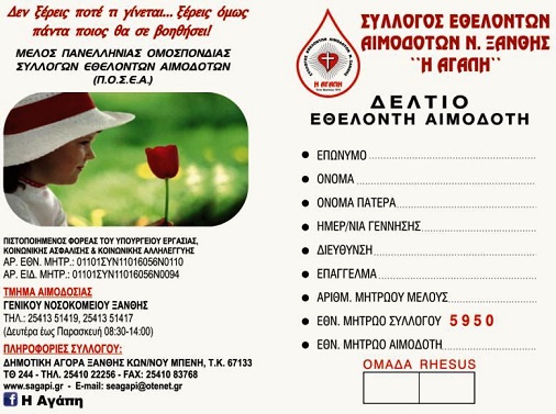 Ο Σύλλογος Εθελοντών Αιμοδοτών Ξάνθης ενημερώνει ότι από τις 30 Μαρτίου ξεκίνησε και στη Διεύθυνση Αιμοδοσίας του Γενικού Νοσοκομείου Ξάνθης η νέα καταγραφή και ταυτοποίηση όλων των εθελοντών αιμοδοτών της περιφερειακής ενότητας Ξάνθης στα πλαίσια του Εθνικού Μητρώου Αιμοδοτών.
