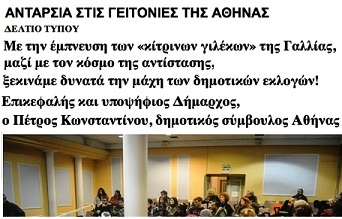 Από τη μια έχουμε ένα βίαιο αυθόρμητο κίνημα στους δρόμους των γαλλικών πόλεων, χωρίς αναφορά σε κάποιο πολιτικό κόμμα, ανοργάνωτο πολιτικά (οργανώνεται μόνο σε επιχειρησιακό επίπεδο, σε μικροκλίμακα κυρίως) και από την άλλη μια πολιτική ομάδα που οργανώνει μια συγκέντρωση σε καθωσπρέπει αίθουσα για να ανακοινώσει την κάθοδό της στις δημοτικές εκλογές της Αθήνας.