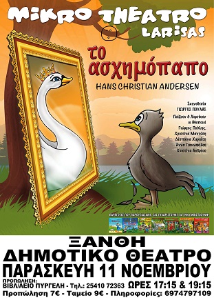 Με “Το ασχημόπαπο” του Hans Christian Andersen επιστρέφει στην Ξάνθη το Παιδικό Θέατρο Λάρισας, για δύο παραστάσεις το απόγευμα (17.15 και 19.15) της Παρασκευής 11 Νοεμβρίου στο δημοτικό αμφιθέατρο.