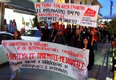 Με κεντρικά συνθήματα “να σταματήσει ο πόλεμος και οι ιμπεριαλιστικές επεμβάσεις” και “αλληλεγγύη σε πρόσφυγες και μετανάστες” έγινε την Πέμπτη 31 Μάρτη η διαδήλωση που διοργάνωσαν η Πρωτοβουλία Αγώνα και Αλληλεγγύης σε Πρόσφυγες και Μετανάστες, η Λαϊκή Αντίσταση, η ΑντΑρΣυΑ και η ΛαΕ, με συμμετοχή και της Κ.Ε.Ε.Ρ.Φ.Α.