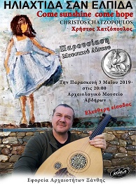 Η Εφορεία Αρχαιοτήτων Ξάνθης προσκαλεί το κοινό στην παρουσίαση του νέου μουσικού δίσκου “Ηλιαχτίδα σαν ελπίδα” του θρακιώτη μουσικοσυνθέτη και τραγουδοποιού Χρήστου Χατζόπουλου, που θα γίνει το βράδυ (20.00) της Παρασκευής 3 Μαΐου στο Αρχαιολογικό Μουσείο Αβδήρων.