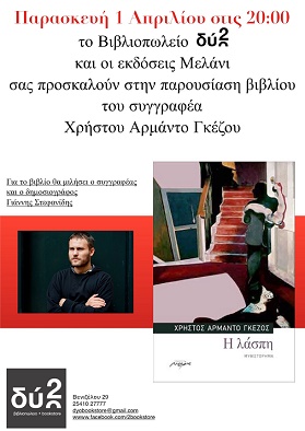 Τον συγγραφέα Χρήστο Αρμάντο Γκέζο και το νέο βιβλίο του με τίτλο “Τραμπάλα” παρουσιάζουν το βράδυ (20.00) της Παρασκευής 4 Νοεμβρίου το βιβλιοπωλείο “Δύο” και οι εκδόσεις “Μελάνι”.