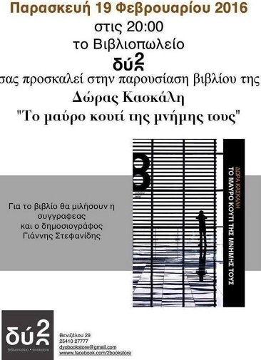 Την Δώρα Κασκάλη και το βιβλίο της “Το μαύρο κουτί της μνήμης τους” παρουσιάζει το βράδυ (20.00) της Παρασκευής 19 Φεβρουαρίου το βιβλιοπωλείο “Δύο”.