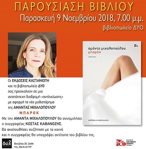 Την Αμάντα Μιχαλοπούλου και το βιβλίο της “Μπαρόκ” παρουσιάζουν το απόγευμα (19.00) της Παρασκευής 9 Νοεμβρίου το Βιβλιοπωλείο “Δύο” και οι εκδόσεις Καστανιώτη.
