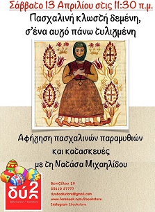 Αφήγηση πασχαλινών παραμυθιών και κατασκευές με τη Νατάσα Μιχαηλίδου το πρωί (11.30) του Σαββάτου 13 Απριλίου στο βιβλιοπωλείο “Δύο”.