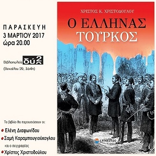 Τον Χρίστο Χριστοδούλου και το βιβλίο του “Ο Έλληνας Τούρκος” παρουσιάζουν το βράδυ (20.00) της Παρασκευής 3 Μαρτίου το βιβλιοπωλείο “Δύο” και οι εκδόσεις “Επίκεντρο”. Για το βιβλίο θα μιλήσουν ο συγγραφέας και οι δημοσιογράφοι Ελένη Διαφωνίδου και Σαμή Καραμπουγιούκογλου.