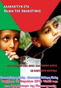 Εκδήλωση αλληλεγγύης στα παιδιά και στον λαό της Παλαιστίνης διοργανώνουν το πρωί (10.30) του Σαββάτου 13 Απριλίου στο αμφιθέατρο της Πολυτεχνικής Σχολής Ξάνθης η Επιτροπή Ειρήνης και ο Διδασκαλικός Σύλλογος Ξάνθης.