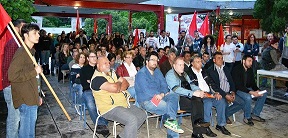 Χαιρετισμό απηύθυνε ο υποψήφιος ευρωβουλευτής Μουράτ Χατζόγλου και ακολούθησε η κεντρική ομιλία της εκδήλωσης από τον Θοδωρή Χιώνη, γραμματέα του Κεντρικού Συμβουλίου της Κ.Ν.Ε., μέλος της Κεντρικής Επιτροπής του Κ.Κ.Ε. και υποψήφιο ευρωβουλευτή του κόμματος. Τονίστηκε η μεγάλη και επιτακτική ανάγκη, ο εργαζόμενος λαός να απορρίψει τόσο τους πανηγυρισμούς της κυβέρνησης για την περίφημη “έξοδο στις αγορές” και το πρωτογενές πλεόνασμα, όσο και τις αυταπάτες που σπέρνει ο ΣυΡιζΑ και άλλες πολιτικές δυνάμεις για δήθεν άμεσες και εύκολες φιλολαϊκές λύσεις μέσα στα πλαίσια της λυκοσυμμαχίας της Ε.Ε. και της εξουσίας των μονοπωλίων.