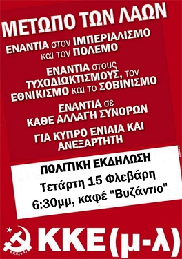 Πολιτική εκδήλωση-συζήτηση με θέμα “Ιμπεριαλιστικές επεμβάσεις, ελληνοτουρκικές σχέσεις, κυπριακό” διοργανώνει το απόγευμα (18.30) της Τετάρτης 15 Φεβρουαρίου στο café “Βυζάντιο” το Κ.Κ.Ε.(μ-λ) Ξάνθης, σημειώνοντας τα ακόλουθα: