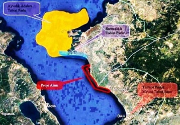 Κατά του προγράμματος τοποθετήθηκαν φορείς του Αϊβαλί, καταγγέλλοντας ότι δημιουργεί σοβαρούς περιβαλλοντικούς κινδύνους τόσο για το θαλάσσιο περιβάλλον της περιοχής όσο και της ακτής και των αρχαιοτήτων, μιας και προστατεύεται και από τον αρχαιολογικό νόμο και έχει κηρυχθεί ζώνη προστασίας Α (δηλαδή πρώτης προτεραιότητας) από το τουρκικό υπουργείο Πολιτισμού. Ο δήμαρχος της πόλης Ραχμί Γκεντσέρ ζήτησε με επιστολή του ενημέρωση για την άδεια που εκδόθηκε και η υλοποίηση της οποίας -όπως υποστηρίζεται- μπορεί να προκαλέσει ανεπανόρθωτες ζημιές σε ένα κλειστό οικοσύστημα όπως αυτό των στενών μεταξύ Λέσβου και μικρασιατικών παραλίων.