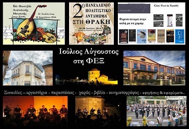 - Πανελλήνιο Πολιτιστικό Αντάμωμα στη Θράκη – 1 έως και 3 Ιουλίου στην κεντρική πλατεία Ξάνθης. Εκατοντάδες νέοι και νέες με τις παραδοσιακές φορεσιές του τόπου τους, θα χορέψουν στο άκουσμα των δημοτικών τραγουδιών της πατρίδας μας
