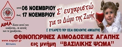Οι εθελοντικές αιμοδοσίες του Νοεμβρίου του 2018 είναι αφιερωμένες στη μνήμη της Βασιλικής Ψωμά. Μιας μεγάλης κυρίας του εθελοντισμού που άφησε μεγάλο αποτύπωμα στα δρώμενα της πόλης και της περιοχής μας.