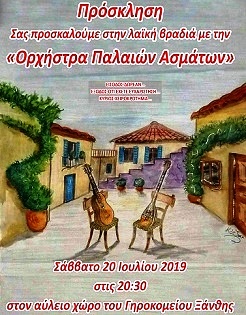 Άλλη μια καλοκαιρινή μουσική εκδήλωση θα πραγματοποιηθεί στον αύλειο χώρο του γηροκομείου Ξάνθης το βράδυ (20.30) του Σαββάτου 20 Ιουλίου. Μια λαϊκή βραδιά με πολλές παλιές αναμνήσεις αγαπημένων τραγουδιών του προηγούμενου αιώνα, από την εθελοντική ομάδα “Ορχήστρα παλαιών ασμάτων“.