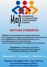 Το πρωί (11.00) της Κυριακής 5 Οκτωβρίου στο Σπίτι Πολιτισμού της Φ.Ε.Ξ. θα πραγματοποιηθεί η ιδρυτική συνέλευση του Καταναλωτικού Συνεταιρισμού «Μαζί», όπως ενημερώνει η «προσωρινή επιτροπή» με ανακοίνωσή της.