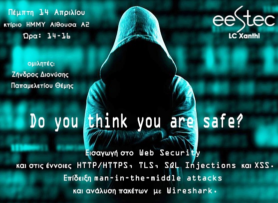 Ημερίδα με θέμα “Εισαγωγή στο web security” διοργανώνει το μεσημέρι (14.00) της Πέμπτης 14 Απριλίου στο αμφιθέατρο Α2 του κτιρίου Α των Η.Μ.Μ.Υ στην πανεπιστημιούπολη Κιμμερίων η EESTEC LC Xanthi.