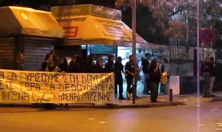 Από τον Αύγουστο του 2013 τέσσερις εργαζόμενοι του καταστήματος «ΚΑΦΕΝΑΙ» (τώρα έχει το όνομα «ΜΥΡΣΙΝΗ») ξεκινήσαμε τον αγώνα μας, διεκδικώντας δεδουλευμένα (όπως είχαν κάνει και άλλοι οχτώ συνάδελφοί μας το 2010). Ο αγώνας μας ο οποίος συνεχίζεται μέχρι και σήμερα περιλαμβάνει παραστάσεις διαμαρτυρίας, παρεμβάσεις σε αντιρατσιστικά φεστιβάλ και σε παζάρια χωρίς μεσάζοντες, συνεντεύξεις στα Μ.Μ.Ε., ενημερώσεις σε βουλευτές, σωματεία, συλλογικότητες κ.λ.π. Παράλληλα κινηθήκαμε και σε νομικό επίπεδο καταθέτοντας ασφαλιστικά μέτρα και αγωγές στα οποία τελικά κερδίσαμε.