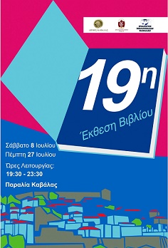 Ξεκίνησε χθες (Σάββατο 8 Ιουλίου) στην παραλία της Καβάλας και θα διαρκέσει μέχρι την Πέμπτη 27 Ιουλίου η 19η Έκθεση Βιβλίου Καβάλας που διοργανώνουν ο δήμος και η τοπική δημοτική βιβλιοθήκη «Βασίλης Βασιλικός», σε συνεργασία με τον σύλλογο βιβλιοπωλών-χαρτοπωλών της περιοχής και την υποστήριξη του Οργανισμού Λιμένος Καβάλας.