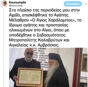 Καμαρωτός-καμαρωτός ποζάρει ο υποψήφιος ευρωβουλευτής του ΣυΡιζΑ και πρώην υπουργός, Π. Κουρουμπλής, σε φωτογραφίες με τον Μητροπολίτη Αιγιαλείας και Καλαβρύτων Αμβρόσιο, γνωστό για τις ρατσιστικές και ακροδεξιές απόψεις του. Τις φωτογραφίες μάλιστα ανέβασε ο ίδιος ο Κουρουμπλής στα μέσα κοινωνικής δικτύωσης, θέλοντας προφανώς να χαϊδέψει και μερικά αυτιά ψηφοφόρων που «γαργαλιούνται» από τα κηρύγματα μίσους του συγκεκριμένου Μητροπολίτη. Είμαστε περίεργοι, αν ο Κουρουμπλής ανέλυσε στον Αμβρόσιο το «προοδευτικό μέτωπο» του ΣυΡιζΑ «ενάντια στην ακροδεξιά». Αν κρίνουμε πάντως από τη συχνότητα (και το καμάρι) με την οποία στελέχη του ΣυΡιζΑ και του κρατικού μηχανισμού φωτογραφίζονται με διάφορους ακροδεξιούς και χρυσαυγίτες, προκύπτει αβίαστα το συμπέρασμα ότι το «προοδευτικό» τους μέτωπο βρωμάει μούχλα και ναφθαλίνη, όσο κι αν ο ΣυΡιζΑ προσπαθεί να διασκεδάσει τις (προεκλογικές) εντυπώσεις, διαρρέοντας κατόπιν εορτής ότι υπάρχει δυσαρέσκεια για τον Κουρουμπλή, ακόμα και σκέψεις για αποπομπή του. Θυμίζουμε, άλλωστε, ότι πριν από μερικές μέρες ο γραμματέας του Ε.Δ.Σ.Ν.Α., στέλεχος του ΣυΡιζΑ, πόζαρε με τους χρυσαυγίτες Παππά και Ηλιόπουλο αφού πρώτα τους ξενάγησε στη χωματερή, ενώ είχαν προηγηθεί άλλα «τρυφερά» ενσταντανέ ανάμεσα σε χρυσαυγίτες και στελέχη της κυβέρνησης ή ΣΥΡΙΖΑίους της τοπικής διοίκησης σε νησιά της άγονης γραμμής, επίσημες εκδηλώσεις κ.α. Ε, τόσες συναντήσεις μάλλον ξέπλυμα μυρίζουν, παρά «τυχαίο γεγονός»…