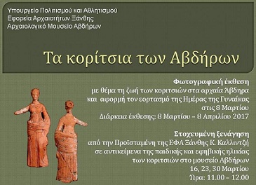 Με αφορμή την παγκόσμια ημέρα της γυναίκας στις 8 Μαρτίου, η Εφορεία Αρχαιοτήτων Ξάνθης οργανώνει στο Αρχαιολογικό Μουσείο Αβδήρων μηνιαία φωτογραφική έκθεση με τίτλο «Τα κορίτσια των Αβδήρων» και θέμα τη ζωή των κοριτσιών στα αρχαία Άβδηρα, όπως μας είναι γνωστή από παιχνίδια, ειδώλια, κοσμήματα και άλλα αντικείμενα. Στους επισκέπτες θα διανεμηθεί το φυλλάδιο «Κουβεντούλες με τις αρχαίες αβδηρίτισσες».
