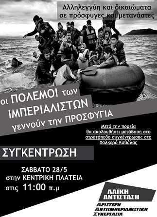 Συγκέντρωση-διαδήλωση διοργανώνει το πρωί (11.00) του Σαββάτου 28 Μαΐου η Λαϊκή Αντίσταση – Αριστερή Αντιιμπεριαλιστική Συνεργασία Ξάνθης στην κεντρική πλατεία της πόλης. Στη συγκέντρωση θα υπάρχει κείμενο υπογραφών για την μετεγκατάσταση των προσφύγων (μπορείτε να υπογράψετε και εδώ), ενώ στις 13.00 θα αναχωρήσει λεωφορείο από τη Δημοτική Αγορά Ξάνθης για το Χαλκερό Καβάλας.