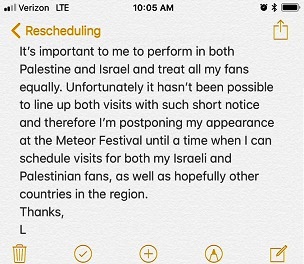 Με το εικονιζόμενο μήνυμά της ανακοίνωσε ότι αναβάλλει την εμφάνισή της στο Ισραήλ την Παρασκευή, επειδή είναι αδύνατον να προγραμματίσει συναυλία και στην Παλαιστίνη.