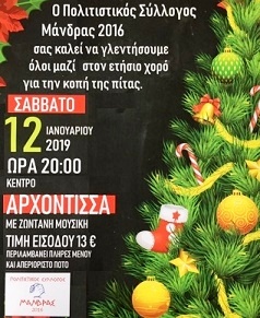 Ο Πολιτιστικός Σύλλογος Μάνδρας καλεί στον ετήσιο χορό του και στην κοπή της βασιλόπιτας το βράδυ (20.00) του Σαββάτου 12 Ιανουαρίου στο κέντρο διασκέδασης «Αρχόντισα», με ζωντανή μουσική και είσοδο 13€ με πλήρες μενού και απεριόριστο ποτό.