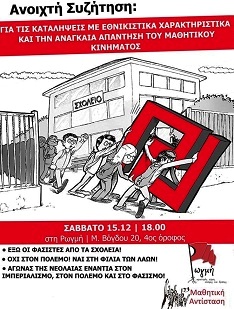 Η Μαθητική Αντίσταση παίρνει πρωτοβουλία με βάση τις τελευταίες εξελίξεις να προχωρήσει σε ανοιχτή συζήτηση στο στέκι “Ρωγμή” το απόγευμα (18.00) του Σαββάτου 15 Δεκεμβρίου, σημειώνοντας τα ακόλουθα: