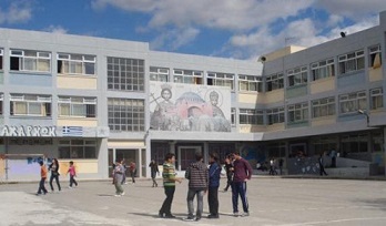 Διαβάζουμε επίσης ότι «το προαύλιο είναι ευρύχωρο, με υποδομή για αθλήματα μπάσκετ, βόλεϊ, ποδοσφαίρου ακόμα και για άλμα σε μήκος». Προς επίρρωσιν όλων αυτών έρχεται η φωτογραφία. Με έναν τεράστιο (ύψους δύο ορόφων και πλάτους δέκα μέτρων) πίνακα που απεικονίζει την Αγιασοφιά και βυζαντινούς αυτοκράτορες! Δε νομίζουμε πως χρειάζονται σχόλια, πέρα από δυο λέξεις: εκπαιδευτικός μεσαίωνας!