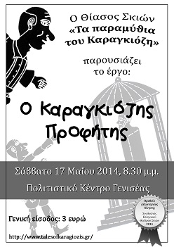 Ο Θίασος Σκιών «Τα παραμύθια του Καραγκιόζη» παρουσιάζει την παράσταση «Ο Καραγκιόζης προφήτης» το βράδυ (20.30) του Σαββάτου 17 Μαΐου στο Πολιτιστικό Κέντρο Γενισέας, με γενική είσοδο τρία ευρώ.
