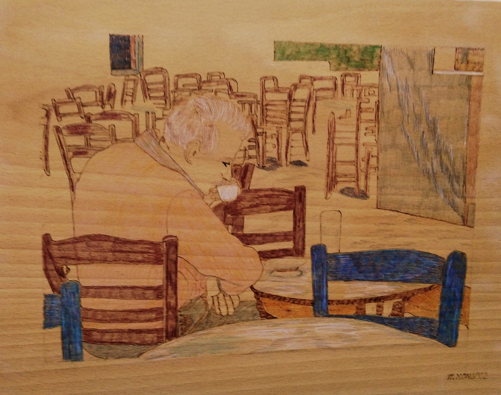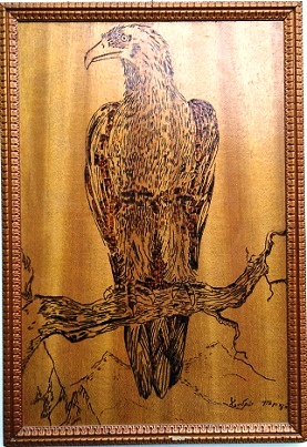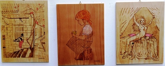 Και εξηγεί για την πυρογραφία: “Είναι μία τέχνη από αρχαιοτάτων χρόνων, όπου αντί για πινέλο χρησιμοποιούμε μια πυρακτωμένη ακίδα και αποτυπώνουμε το σχέδιο στο ξύλο (μπορεί να γίνει και σε δέρμα) καίγοντάς το. Θέλει σταθερό χέρι και στην αρχή ζοριζόμουν, όμως είναι κάτι που αποκτιέται με την εμπειρία. Σημαντικό ρόλο παίζουν ο πυρογράφος και οι μύτες του που πρέπει να είναι καθαρές. Ο πυρογράφος έχει σκάλες και ανεβάζεις την ένταση ανάλογα με το πόσο θέλεις να κάψεις“.