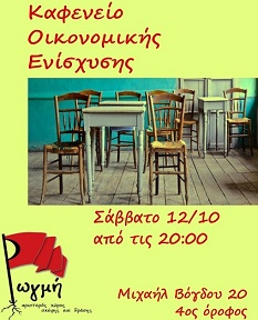 Καφενείο οικονομικής ενίσχυσης διοργανώνεται το βράδυ (20.00) του Σαββάτου 12 Οκτωβρίου στον αριστερό χώρο σκέψης και δράσης “Ρωγμή”.