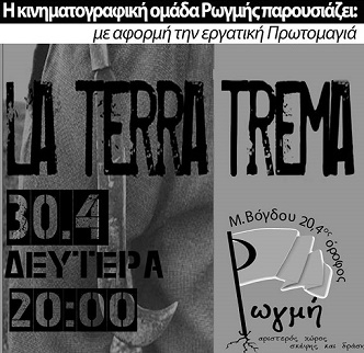 Η ταινία του Luchino Visconti “Η γη τρέμει” προβάλλεται το βράδυ (20.00) της Δευτέρας 30 Απριλίου στη “Ρωγμή”, με αφορμή τον εορτασμό της εργατικής πρωτομαγιάς.