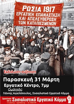 Εκδήλωση για τα εκατό χρόνια από τη ρωσική επανάσταση διοργανώνει το απόγευμα (16.00-20.00) της Κυριακής 12 Νοεμβρίου στο Εργατοϋπαλληλικό Κέντρο Ξάνθης το Σοσιαλιστικό Εργατικό Κόμμα. Κεντρικά θέματα “Η εργατική τάξη και οι μπολσεβίκοι – η διαλεκτική της νίκης” και “Τα διδάγματα του Οκτώβρη σήμερα“.